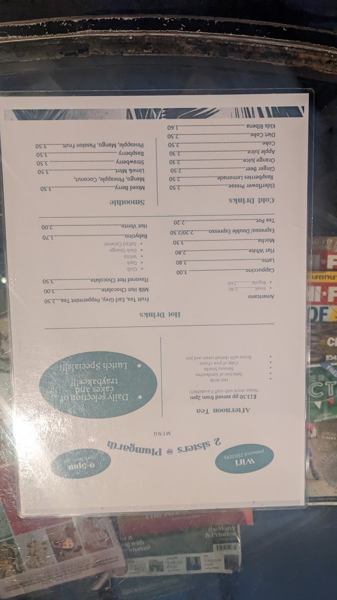 2 Sisters Cafe at Plumgarths Menu